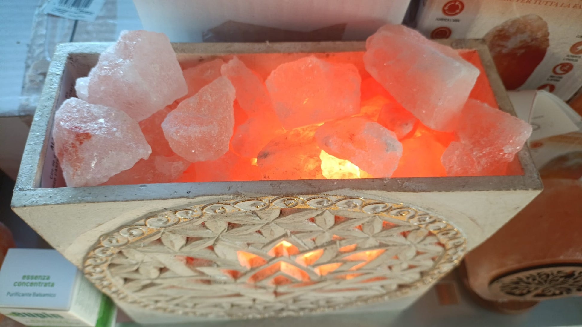 LAMPADA DI SALE ROSA DELL'HIMALAYA BRACIERE FIORE DELLA VITA E FIORE DI LOTO